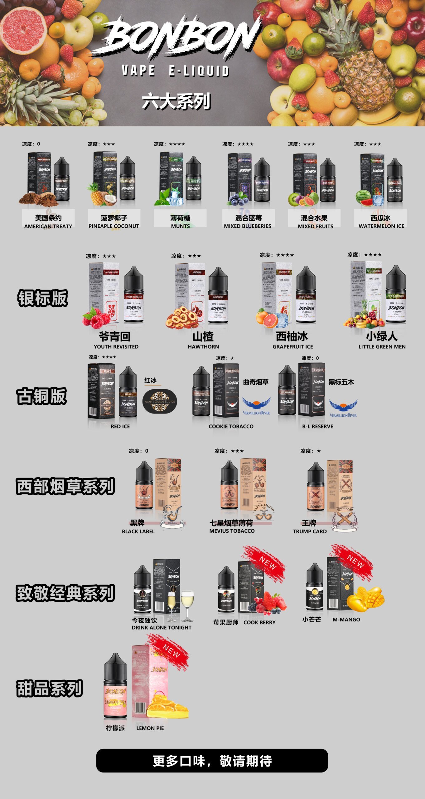 口味: 西柚 红冰 山楂 混合水果 惡魔之吻 薄荷糖 菠萝椰汁 西瓜冰 莓果廚師 混合蓝莓 法式檸檬派 今夜無飲 小芒芒 七星菸草薄荷 黑牌煙草 王牌煙草 曲奇煙草 黑標五木煙草 小綠人